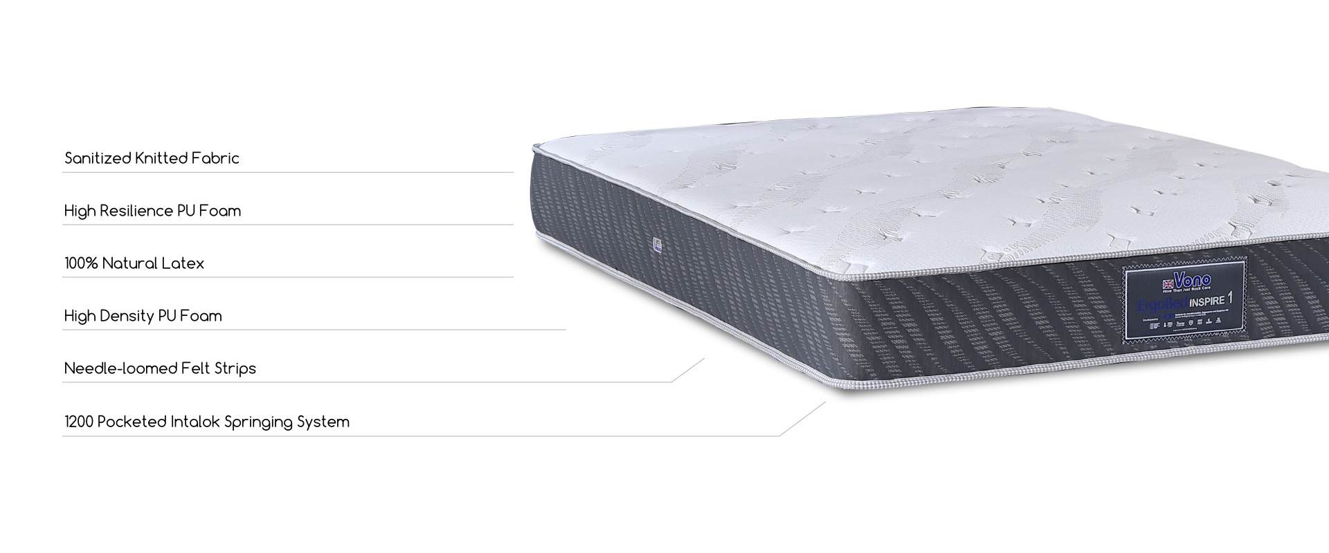 Enhance your sleep experience from day one with our special bedding offer. Every purchase of a Single or Super Single Inspire 1 mattress comes with one (1) complimentary Vono Pillow, while Queen or King size mattresses include two (2) free Vono Pillows. Plus, safeguard your new mattress with a free Vono Mattress Protector, tailored to fit and extend the life of your mattress.