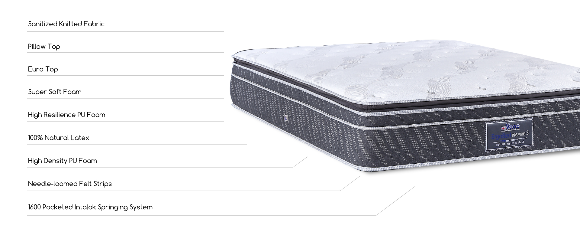 Enhance your sleep experience from day one with our special bedding offer. Every purchase of a Single or Super Single Inspire 3 mattress comes with one (1) complimentary Vono Pillow, while Queen or King size mattresses include two (2) free Vono Pillows. Plus, safeguard your new mattress with a free Vono Mattress Protector, tailored to fit and extend the life of your mattress.
